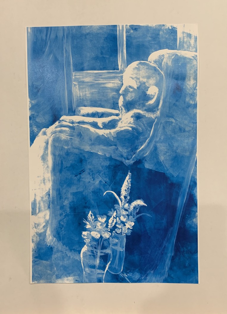 In order to reflect the ongoing recovery of the survivors post-liberation and the challenge of rejoining society, I chose to depict a non-descript survivor years after his liberation "sitting shiva" in mourning for his home, his family, and himself. Though the traditional mourning period typically lasts for seven days, this man has been mourning for decades. The flowers at the foot of his seat represent the failed attempts of non-survivors to sympathize with him, though the gestures are positive in nature. The battle is never over.