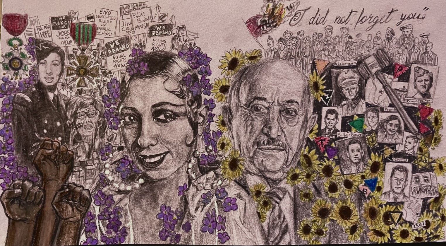 Simon Wiesenthal was an Austrian Jew who survived twelve concentration camps, and afterwards made it his goal to bring justice rather than revenge to Nazi war criminals. I've depicted different images relating to cases he worked on. The patches represent the different victims he believed in remembering Holocaust victims. The sunflowers reference his book, The Sunflower, which discusses the moral dilemma of forgiving Nazis. Josephine Baker was a black bisexual American and performer who grew in her fame in France due to racism in America. She joined the French military as a spy using fame as her cover and got classified information. I represented her by placing references to the civil rights movement and her activism like the clenched fists and protesters. The violet is a symbol of bisexuality. This piece represents their moral courage to defend others.
