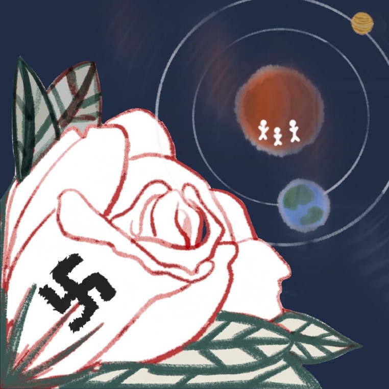 The white rose along with the deteriorating swastika signifies the White Rose Society that opposed the Nazi regime. The solar system with the outlines of people represents Galileo Galilei and the adversity he faced against those who did not believe his discovery of the earth revolving around the sun. both exemplify moral courage by standing up for their beliefs when difficult.