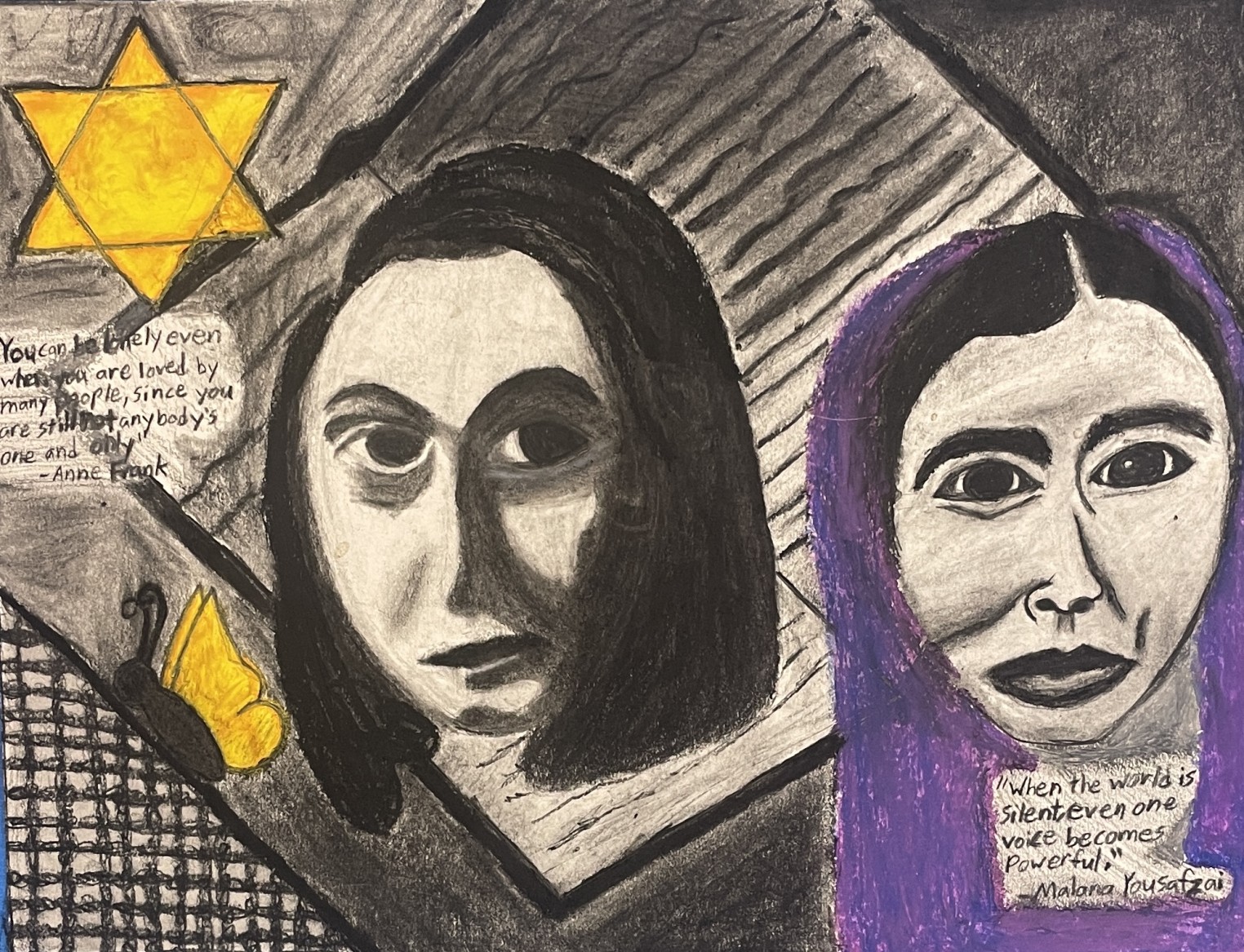 I chose Anne Frank and Malala Yousafzai for my inspiration for "Strong Voices." Anne Frank's voice is heard in the diary she left behind when she and her family were discovered in hiding by the Nazis. She wrote about the persecution and prejudice they encountered which led to them going into hiding. Anne also described her hopes and dreams as a teenager. Her voice, through her diary, lives on; read by many generations. Malala Yousafzai raises her voice today to speak out against the education bans imposed by the Taliban on girls in Pakistan. She survived being shot in the head for speaking out. Malala became the youngest-ever Nobel laureate. She continues to raise her voice against the prejudice the Taliban impose on women.