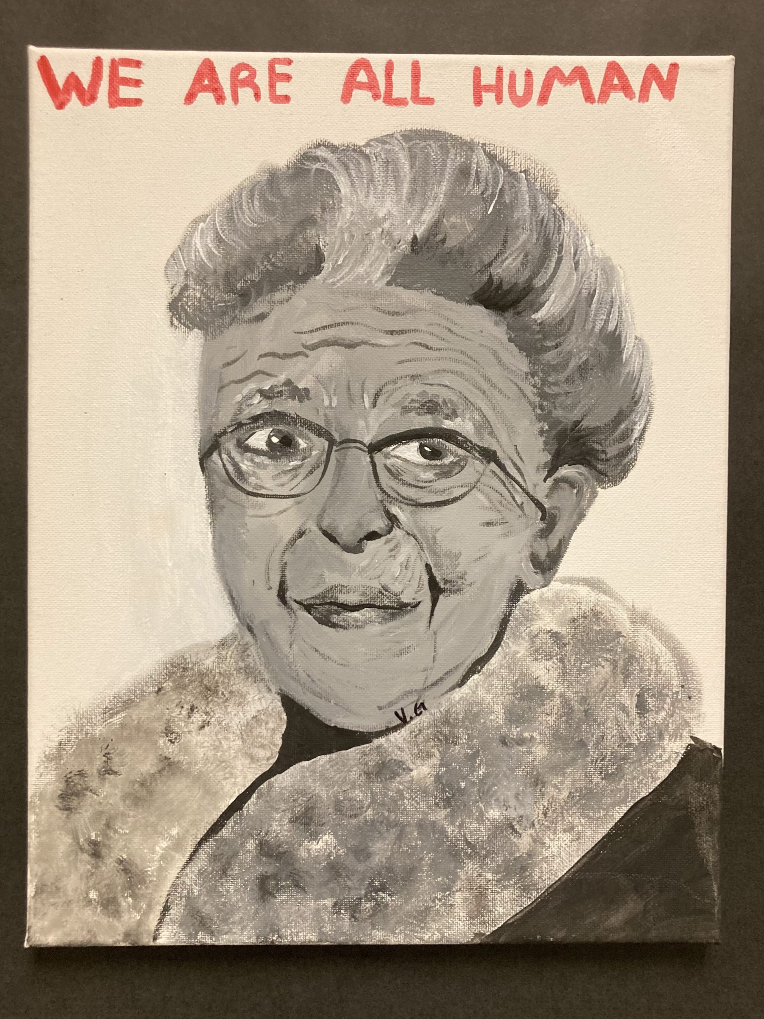 Corrie ten Boom, motivated by God and love, became a historical hero. Growing in a family of love and acceptance reflects that she is the prime example of Righteous Among the Nations. Her family loved all when others wouldn't. Her family was punished and murdered for their actions. They risked their lives because they believed all people are equal. This painting represents Corrie ten Boom as she was later in life. The wrinkles represent the progress she made in her life. Her acts of service and love for others teaches us to do the right thing. Do the right thing even if it is hard.